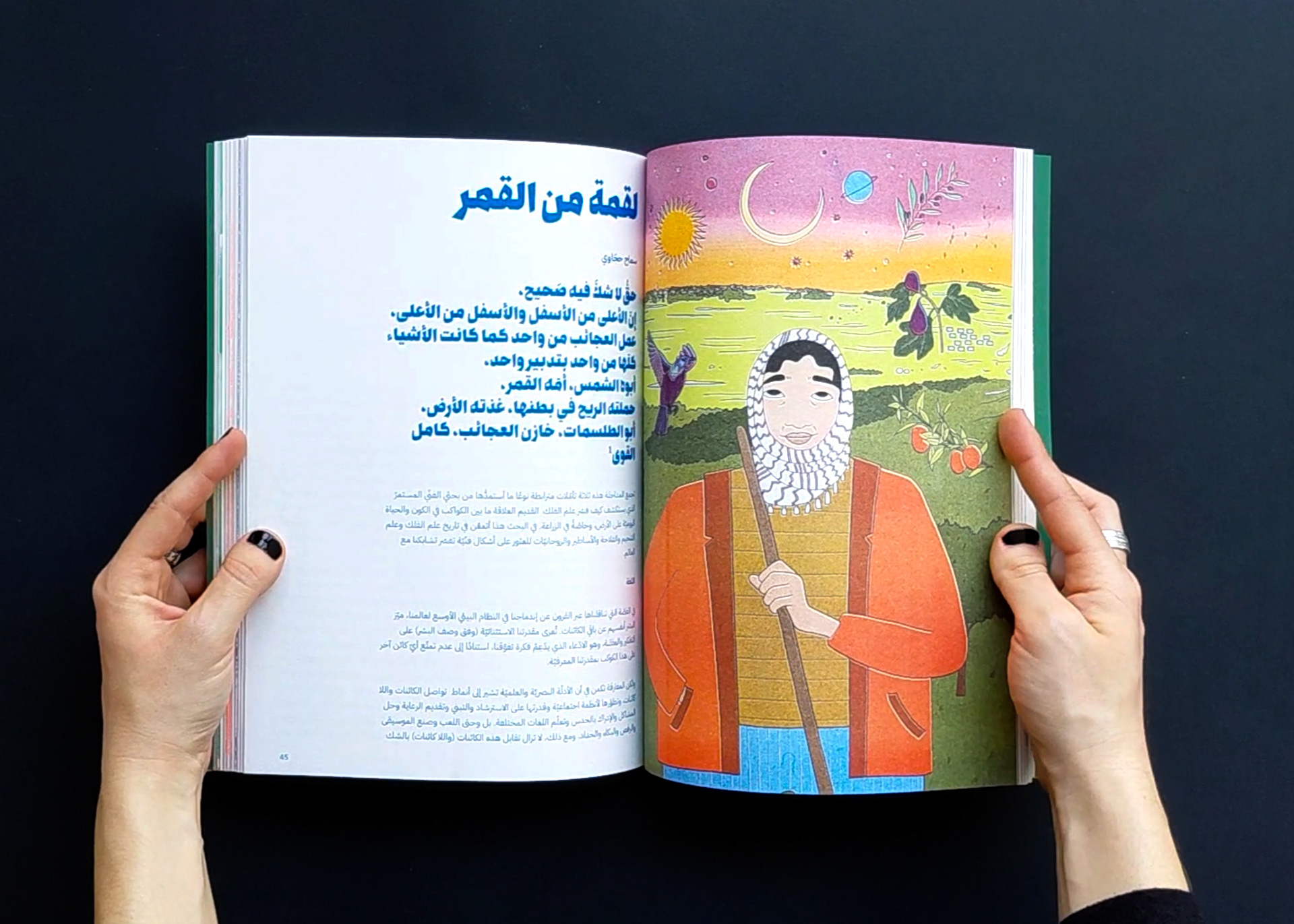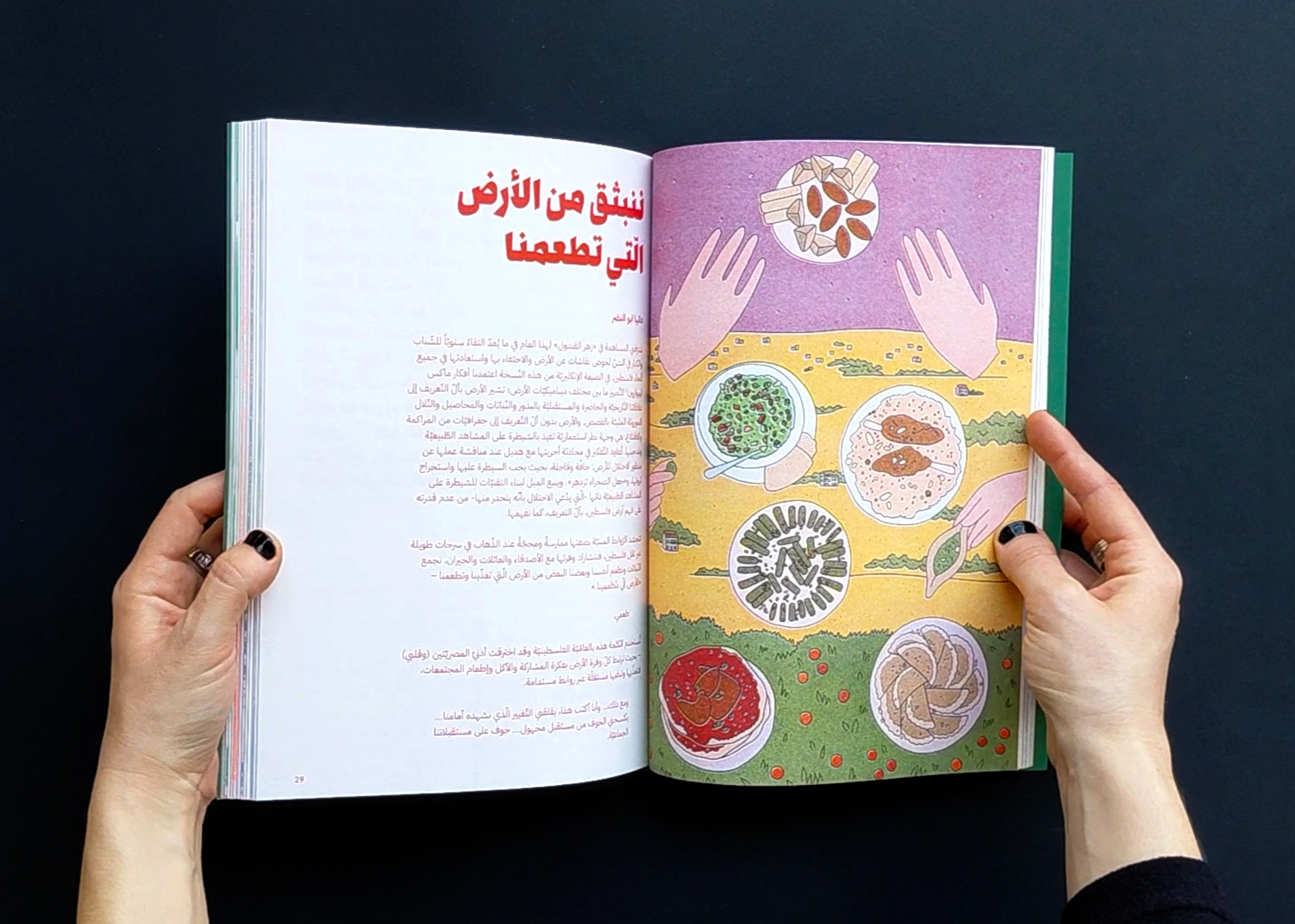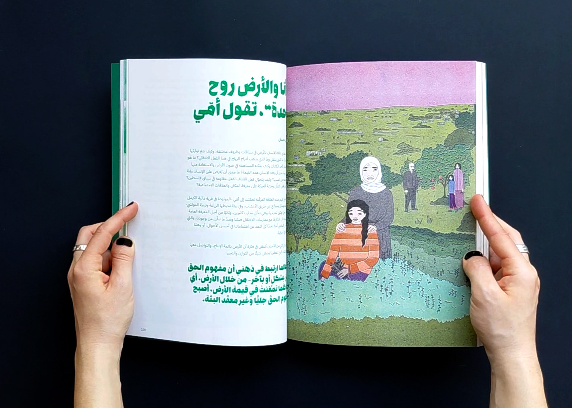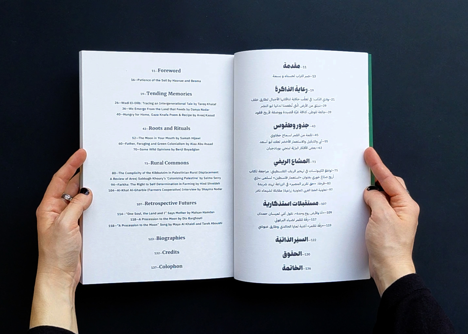 The publication naturally gives priority to Arabic in the design, allowing it to fully spread on the page, while English appears on narrower pages at the end of each contribution, unfolding like a booklet. The magazine is organized into four color-coded sections, each comprising multiple contributions that open with a full-page illustration by Aude Aboul-Nasr, portraying the land and its keepers. Printed in risograph, the colors gain a rich, vibrant texture. The publication also includes a poster and two postcards.