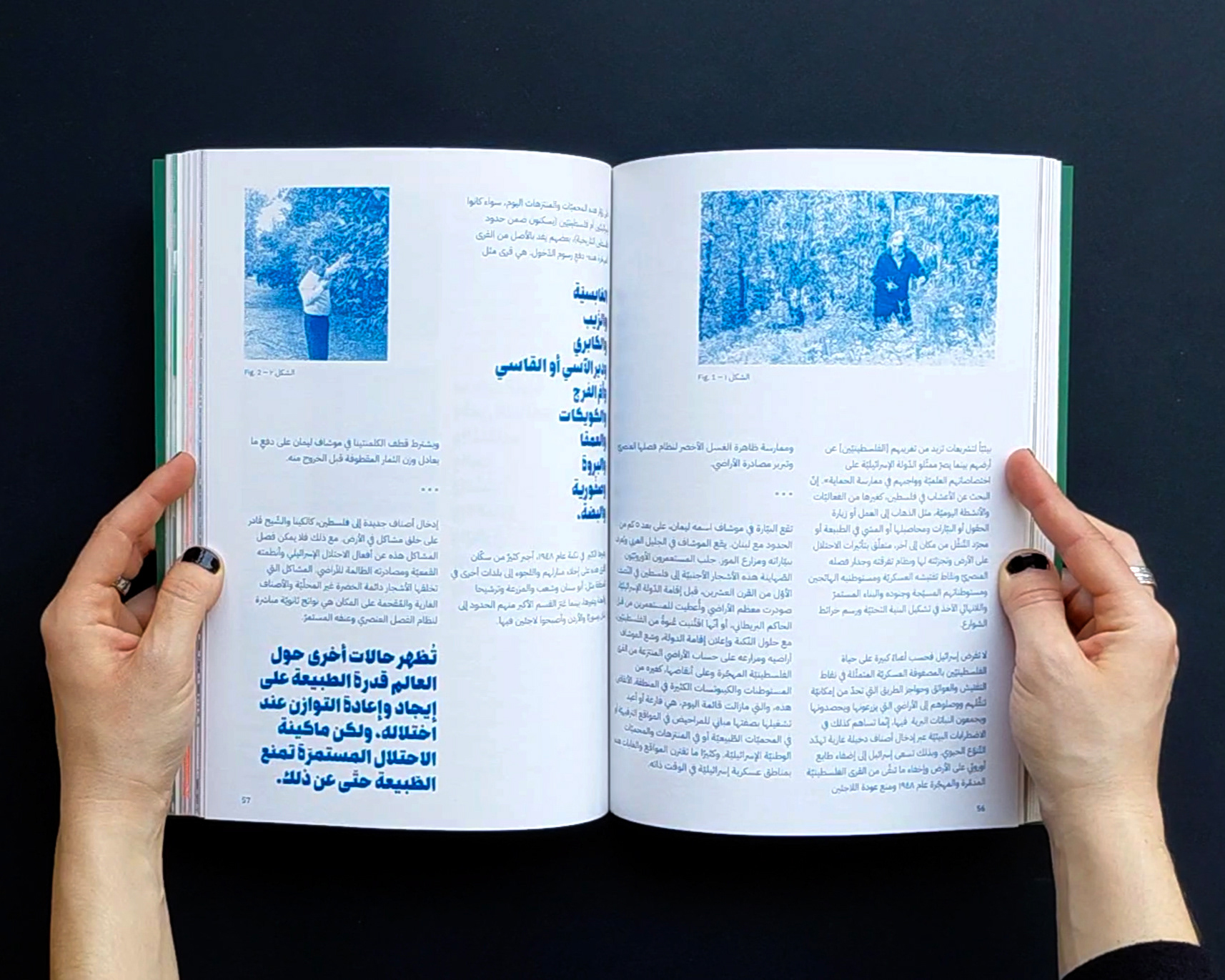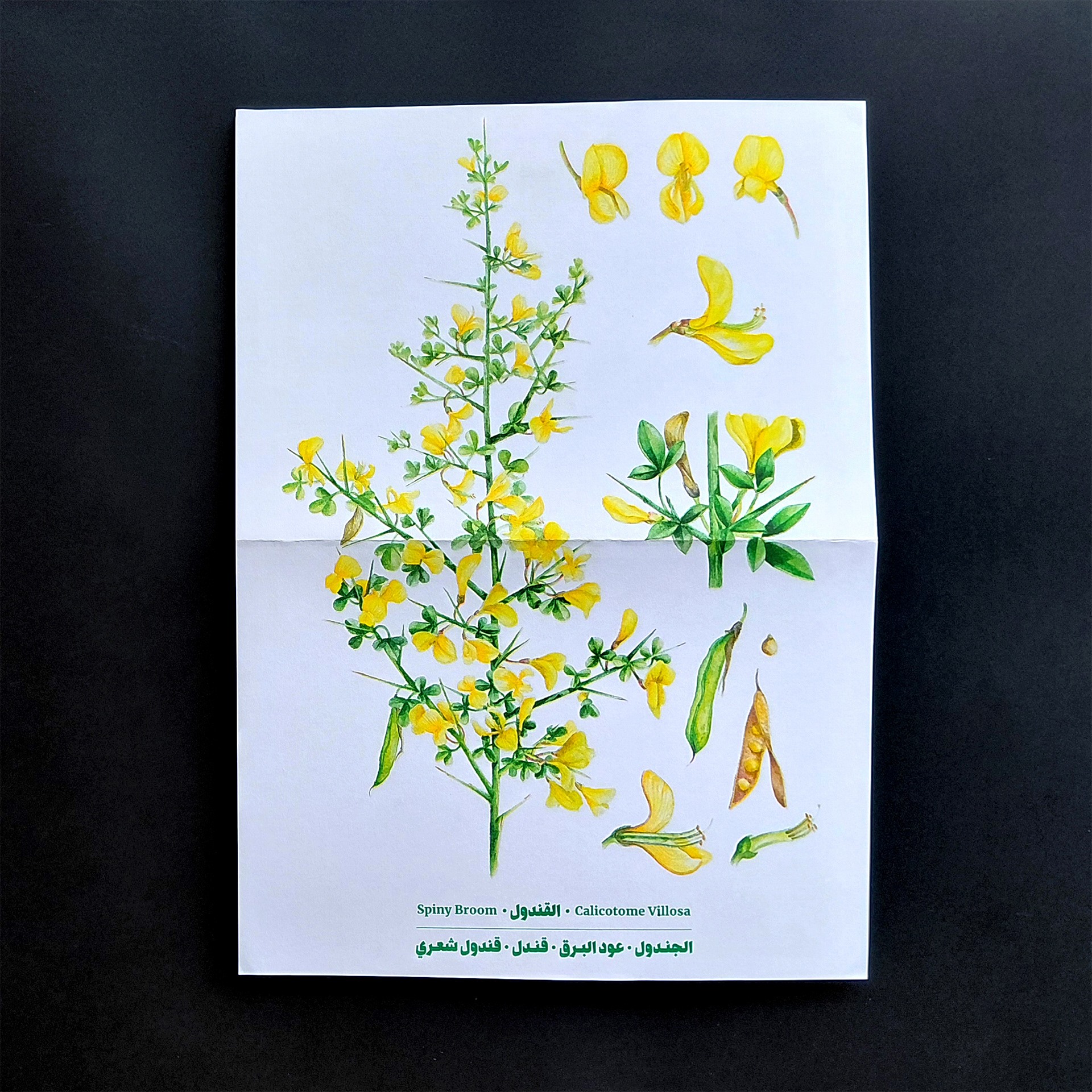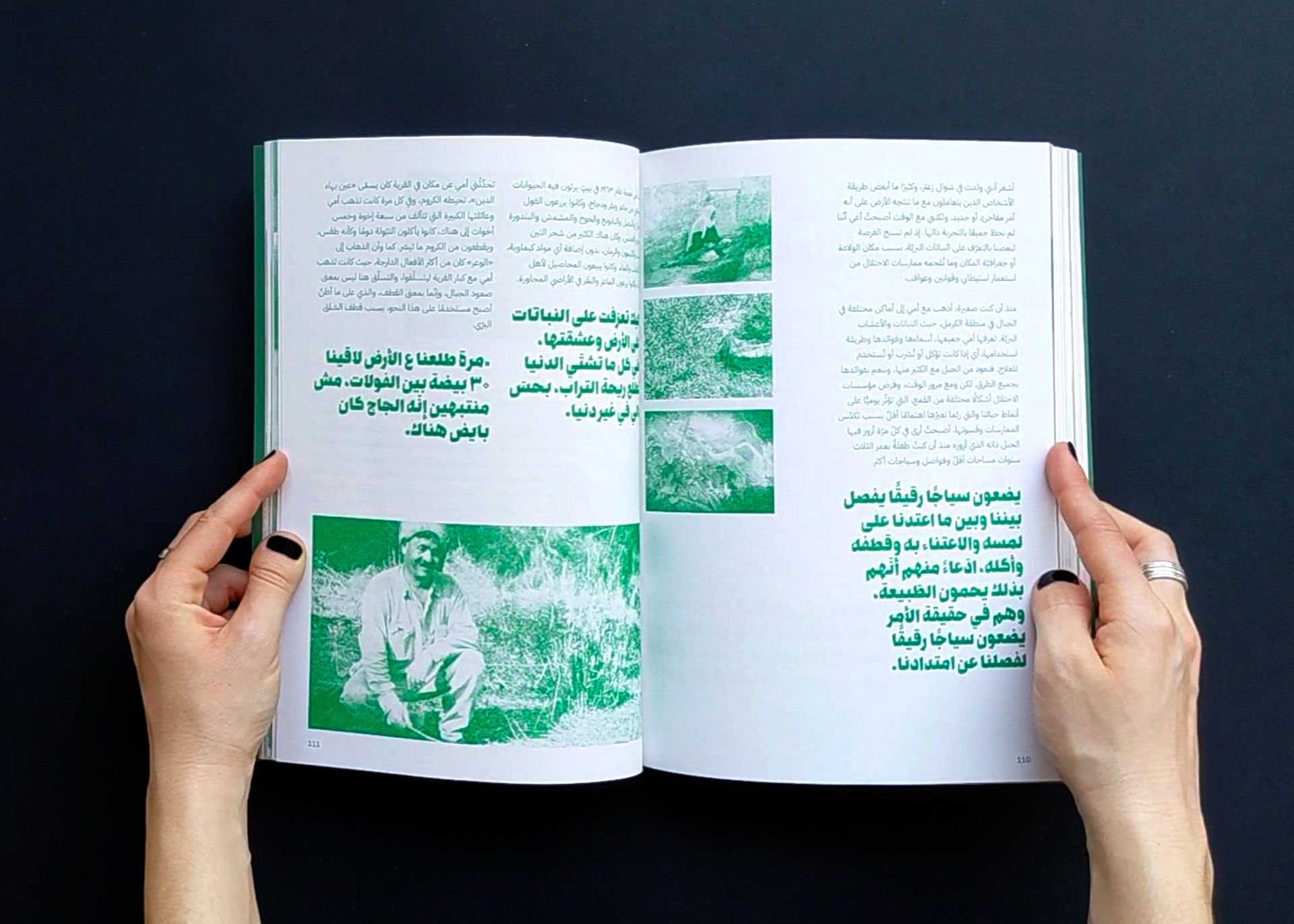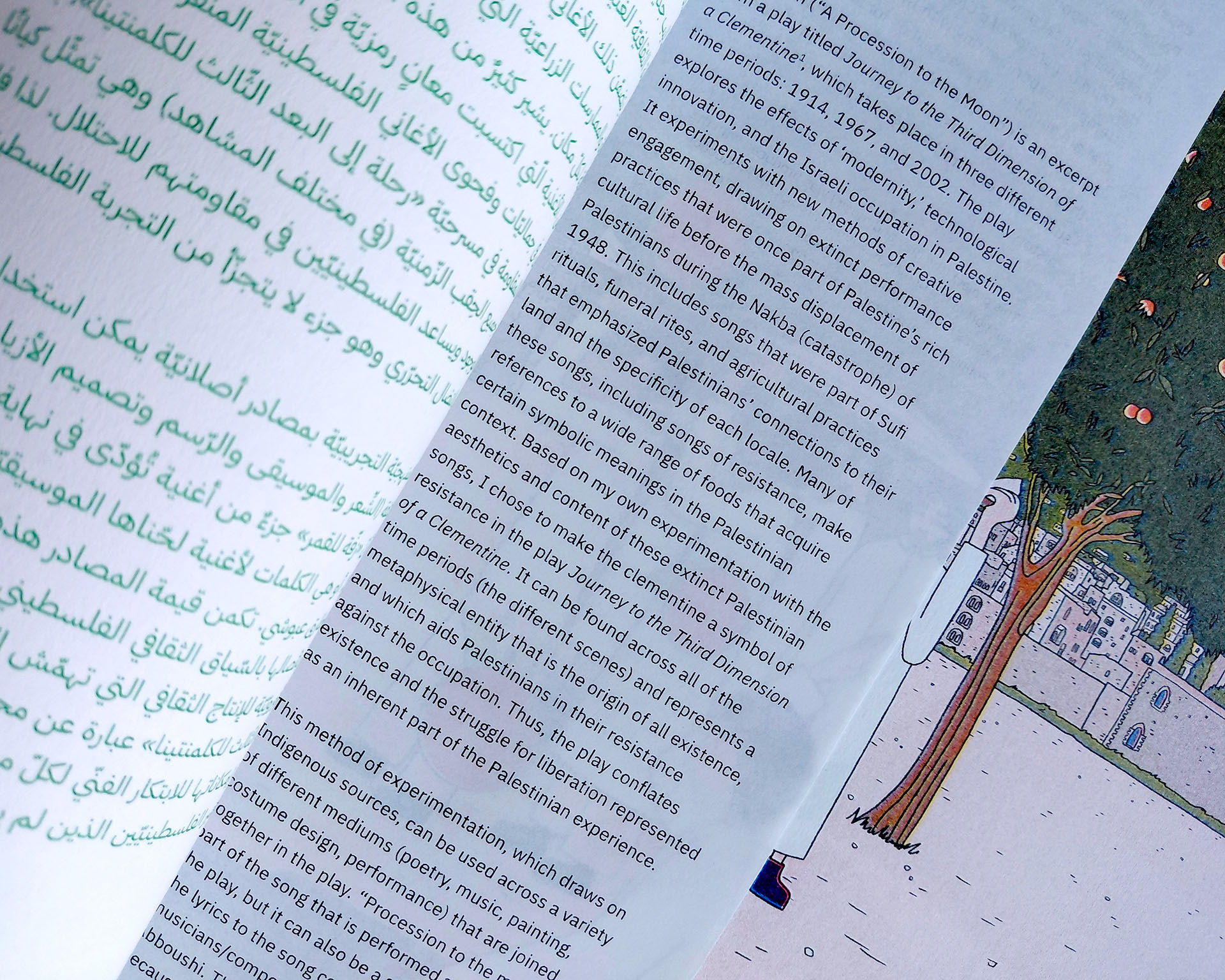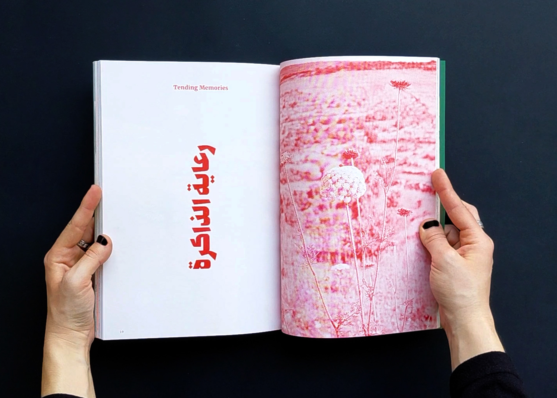 The publication naturally gives priority to Arabic in the design, allowing it to fully spread on the page, while English appears on narrower pages at the end of each contribution, unfolding like a booklet. The magazine is organized into four color-coded sections, each comprising multiple contributions that open with a full-page illustration by Aude Aboul-Nasr, portraying the land and its keepers. Printed in risograph, the colors gain a rich, vibrant texture. The publication also includes a poster and two postcards.