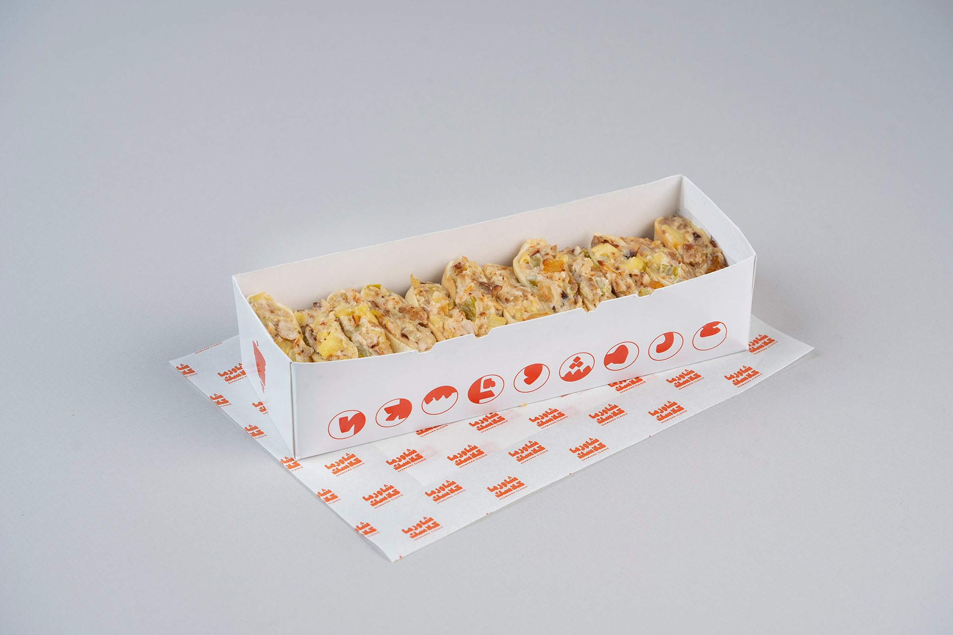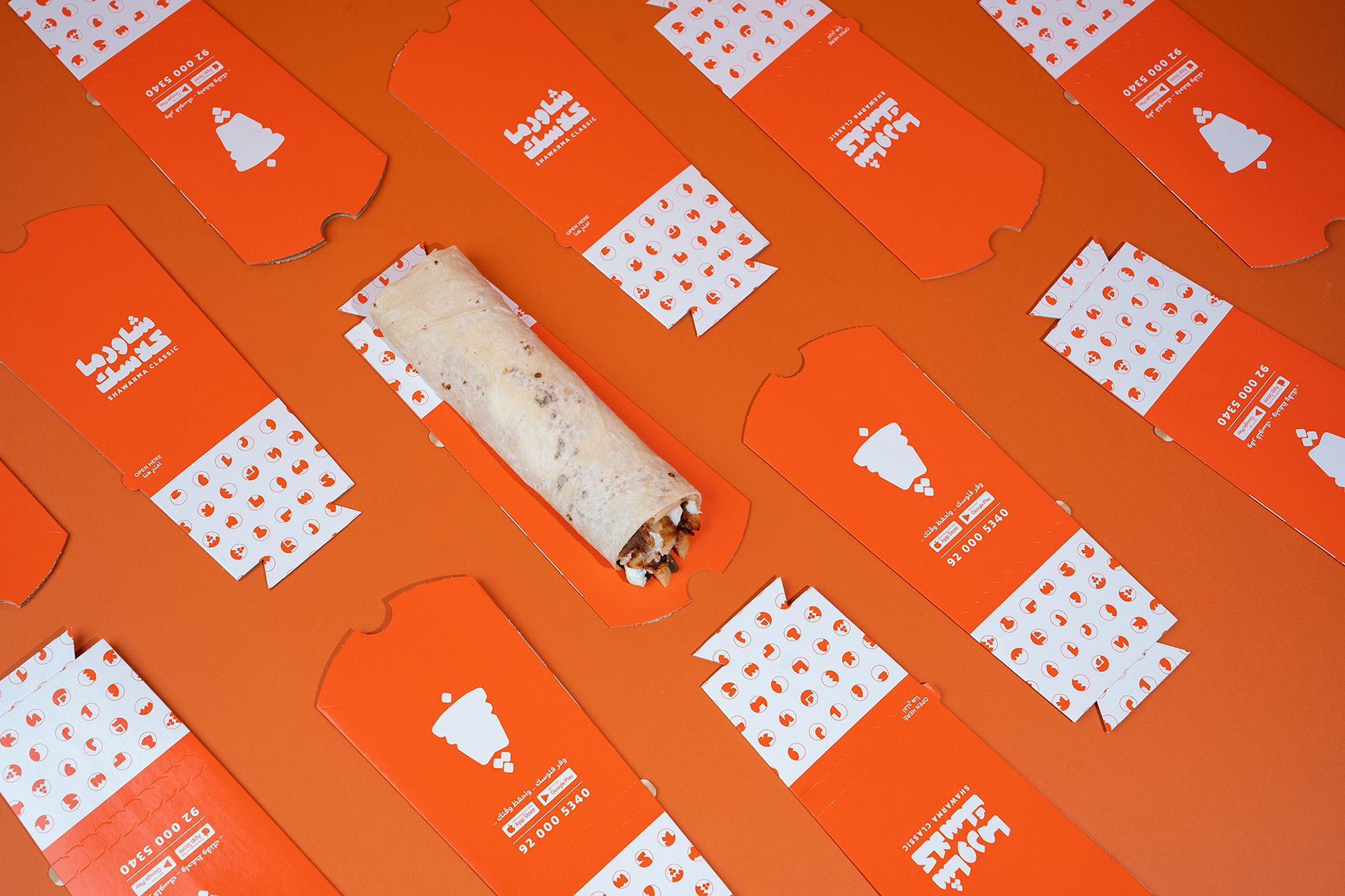 Drawing inspiration from the circular top view of a shawarma sandwich, a distinctive grid was designed using cropped letters from the Arabic logotype. This circular grid formed patterns that were used creatively in packaging and wrapping paper, adding a playful yet cohesive touch to the brand’s visual identity.