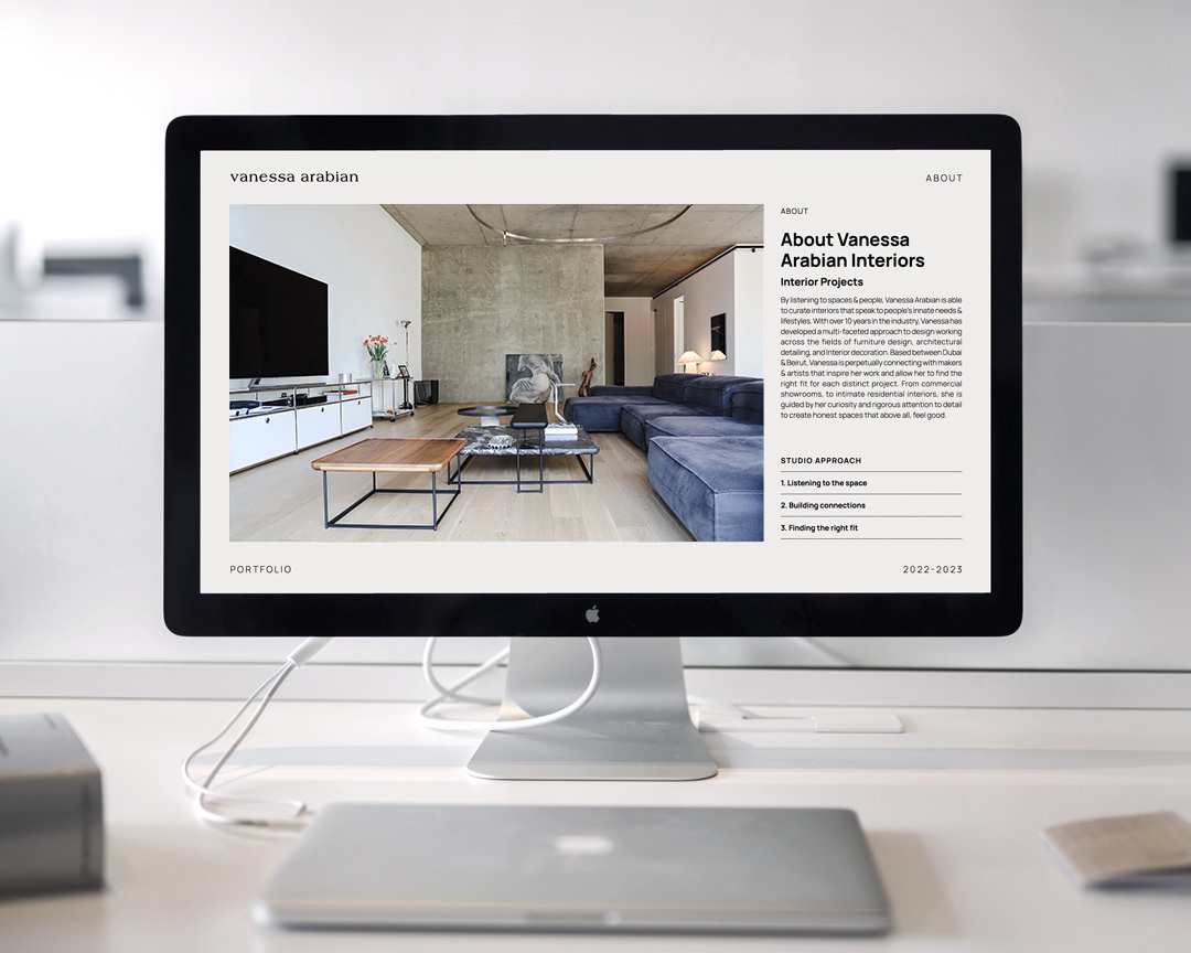Vanessa Arabian is a Lebanese interior architect with a fresh design approach. Infused with a hint of playful minimalism, the sleek and modern logotype embodies her spirit, where each element is chosen with utmost care.